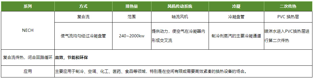 NECH 系列是一款常見的蒸發(fā)冷凝器,復(fù)合流傳熱(空氣和制冷劑蒸汽呈垂直交叉方向)。 這樣的設(shè)計(jì)使空氣均勻經(jīng)過冷凝器,提高換熱效率。